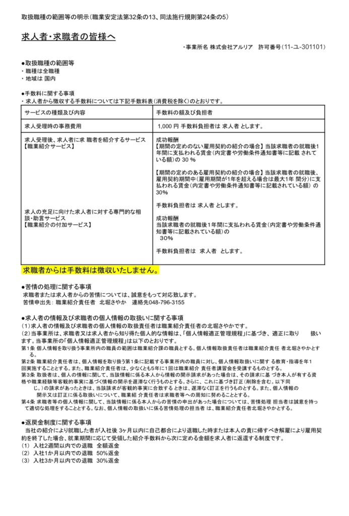 ▶求人者・求職者の皆様へ ・職種の範囲等の明示 ・手数料に関する事項 ※求職者の方の費用は一切かかりません。 ・個人情報の取扱い ・苦情処理体制 ・返戻金制度については上記よりご確認をお願い致します。